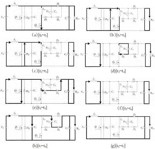ZVT Boost 电路主要有8 种工作模态, 各工作模态对应的等效电路如图4 所示。