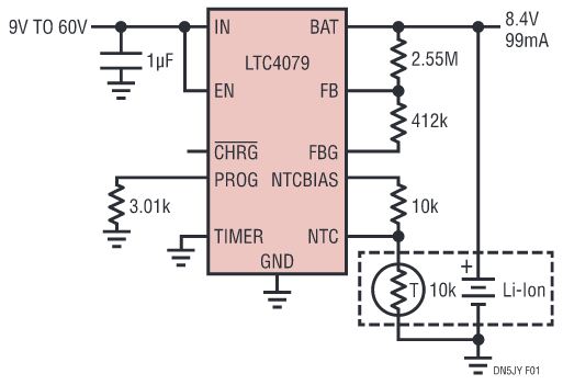 LTC4079是一款宽输入范围独立型充电器,其可由任何2.7V至高达60V的DC电源来供电,因而能够直接采用12V和24V DC系统电源轨或甚至48V工业电源实施恒定电流/恒定电压(CC/CV)充电。其简单与坚固性的组合使之能够轻而易举地满足在这些环境中“持续运作型”系统或后备电池解决方案的充电需求。图1为简单锂离子电池充电器的实例。