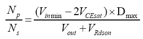 主变压器匝比,计算见公式1,其中和MOSFET有区别的地方在于开关器件结压降变成了IGBT的集电极到发射极压降Vcesat。更高的匝比数可以降低原边流过IGBT的电流有效值,但是另一方面,由于变压器漏感引起的丢失占空比使得最低输入电压220V和额定输出电压13.8V的有效占空比应控制在85%以内,因此最后选择匝数比为13:1:1。