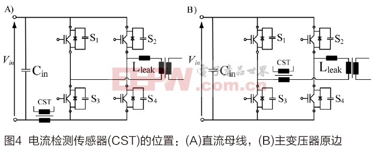 常见的电流传感方案有采样电阻、霍尔传感器,电流检测变压器等等,电流检测变压器具有低成本和电气隔离的特点,本设计采用了电流检测变压器来检测电流信号。在拓扑中电流检测传感器有两种检测位置,如图4所示。