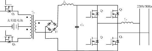 图2为光伏并网逆变器的主电路拓扑图,此系统由前级的DC/DC变换器和后级的DC/AC逆变器组成。DC/DC变换器的逆变电路可选择的型式有半桥式、全桥式、推挽式。考虑到输入电压较低,如采用半桥式则开关管电流变大,而采用全桥式则控制复杂、开关管功耗增大,因此这里采用推挽式电路。DC/DC变换器由推挽逆变电路、高频变压器、整流电路和滤波电感构成,它将太阳能电池板输出的62V的直流电压转换成400V的直流电压。