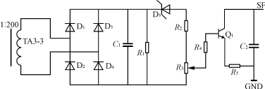 偏磁检测电路如图4所示。图中只画出了磁环的副边。原边两个线圈接在主电路的变压器原边的两个绕组上,流过两个线圈中的电流方向要相反。当变压器发生偏磁时,某一方向的电流异常大,通过电流互感器检测,可在互感器的输出电阻R1上产生一个电压,如果该电压足够大,可以使稳压二极管D5导通,在电位器上产生压降,将电位器的值调到合适的阻值,使电位器上的压降大于三极管的门限电压,使三极管导通,接在芯片SG3525的脚8与地之间的电容放电,然后SG3525中的恒流源对它充电,SG3525重新启动,从而使变压器磁心复位。