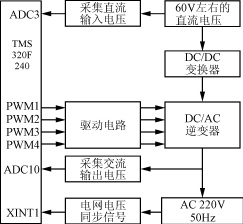 DC/AC逆变器是光伏并网的重点和难点,因此以下将着重阐述该部分。DC/AC逆变器控制框图如图5所示。核心控制芯片采用了TI公司的TMS320F240.尽管单片机也能实现并网逆变器的脉宽调制,但是DSP实时处理能力更强大,因此可以保证系统有更高的开关工作频率。从图5可以清楚看出系统输入和输出信号的情况。