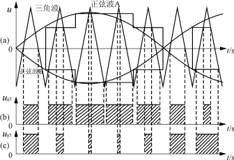 图9(a)正弦波B与三角波的交点决定了Q3的导通时刻;正弦波A与三角波的交点决定了Q5的导通时刻。