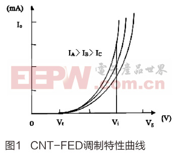 场发射显示器(FED)是采用冷阴极技术的新型平板显示器[1-2]。目前FED显示技术的发展已经历了第一代金属尖锥阵列型和第二代金刚石薄膜型,正向第三代碳纳米管 (CNT) 薄膜型FED发展[3-4]。CNT因其优异的物理和化学性能,使其在场发射、高强度的复合材料以及纳米电子器件等诸多领域具有广阔的应用前景[5-6]。在新型显示技术领域,因CNT发射特性稳定、开启电压低、易于制作,近年来国内外诸多显示器厂家、研究机构以及高校等投入了大量资金和人力对其进行全面和系统的研究与开发,但目前研究主要集中在CNT-FED的发射材料的研究以及显示屏的设计与制作上[7-8],CNT-FED的产品化需要配套的驱动电路控制系统,这是CNT-FED实现量产的一个重要技术,而目前CNT-FED驱动控制电路的研究相对滞后,尤其亮度控制是驱动电路的关键电路,为此本文从CNT-FED的调制特性出发,研究了CNT-FED驱动电路的亮度控制的原理和实现方法。