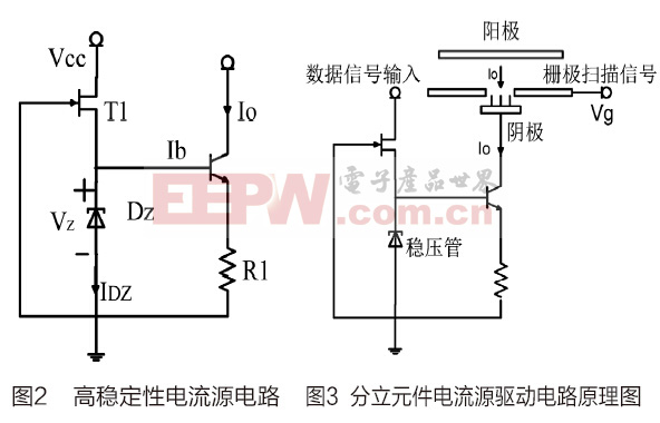 假设某原因导致VZ升高 ,则Vgs下降,Ib 随之下降,IDZ随之下降 ,最后Vz随之下降;反之, Vz下降,Vgs升高,Ib随之升高 ,IDZ随之升高,最后Vz升高。这种电路相当于引入了一个负反馈以此来稳定Vz。可见,图2恒流源电路结构简单,并且输出电流很稳定,与输入电压基本没有关系,适合用作FED平板显示器的阴极恒流源。