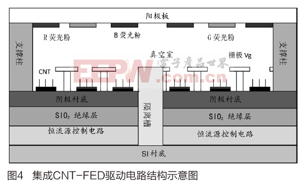 和电压驱动电路相比,每个像素的阴极多了一个恒流源,即每个像素多出四个分立元件;这对于较大屏幕的FED显示屏如1024×768来说,用作阴极恒流源的分立元件总个数为1024×768×4个。这无形中增加了整体驱动电路连线的复杂度和体积,不符合平板显示器轻薄的设计要求。为此,针对阴极电流驱动法,我们又提出一种将部分驱动电路(电流源)集成到阴极SI衬底上去的方法;这种方法既可解决亮度的非线性调节问题,又可满足使FED轻薄的设计要求。