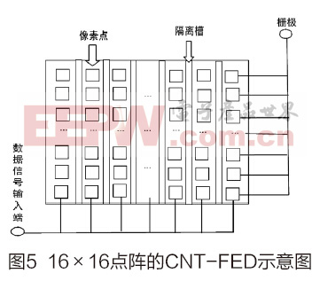 图5所示为16×16点阵的CNT-FED示意图。在生长点阵时,在同一列上所有像素点的阴极恒流源的电源输入端VCC要连在一块,作为数据信号的输入端;同时,在同一行的栅极都要连接在一块,作为这一行的栅电压Vg的输入端。栅极与扫描线驱动连在一起,阴极与数据线驱动相连。施加固定高压在阳极上用来加速电子。对栅极进行逐行选址,施加高电位在选中行对应的栅极,低电位施加于其余行。阴极恒流源的数据信号端施加与所显示图像相应的脉冲,当对应列上需显示,对应的阴极恒流源数据信号端为高电平产生输出电流Io;当所对应列上无显示时,对应的阴极恒流源数据信号端为低电平无电流输出;通过控制阴极上恒流源的数据信号端脉冲的宽度或数目来实现灰度显示;如此逐行、逐帧循环即可实现字符和图形的显示。