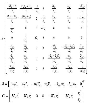 其次,根据Fourier分解[2]将周期信号分解为正弦函数之和,只考虑基波分量,得到所需的近似大信号模型,系统稳态运行后,变量不随时间变化而变化,因此忽略模型中的时变分量,即可得到稳态工作点求解方程并转化成矩阵形式,最后在稳态工作点附近,进行变量分离,获取系统的小信号数学模型,并表示成矩阵形式。