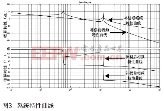 通过调节系数Ku使得系统获较好的低频增益和穿越频率点。如图3所示为补偿前后系统的幅频、相频增益特性曲线。