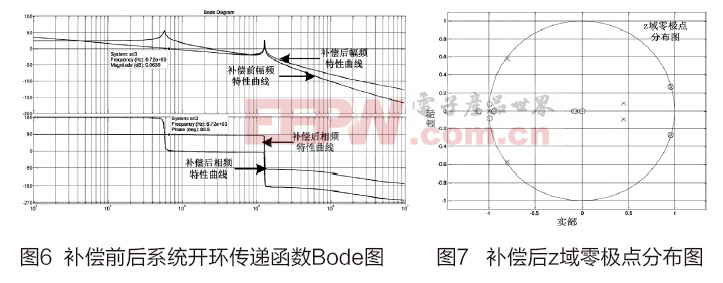 如图6,补偿后系统的开环穿越频率为6.72kHz,相位为88.5°,满足设计要求。同样地,仍需对所设计数字补偿器进行离散域稳定性的验证,对补偿前开环传递函数Gpd(s)以及PID控制器Gcd(s)进行z变换,并乘以