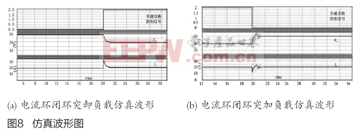 图8所示分别为变换器恒流输出模式下负载突卸、突加的仿真波形。