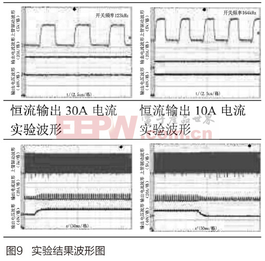 图9为变换器运行于恒流模式,指定输出30A、10A的稳态实验波形以及负载突加、突降时的动态响应实验波形,用以验证本文所设计的数字PID控制器的闭环控制性能。