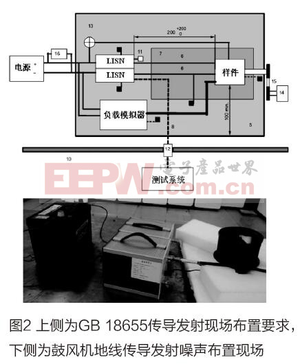 (1)按照标准进行现场布置,然后断开鼓风机供电电源负极与人工网络之间的连接,测试地线背景噪声。为了保证测试结果的可信度,背景噪声应至少比电磁干扰测试的限值低6dB。