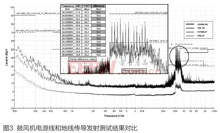 在测试期间,测试设置和测试步骤都遵循了GB 18655:2010的要求,但分析测试结果时,发现电源线传导噪声的峰值在30MHz-40MHz部分频点接近GB 18655:2010的等级3的限值要求,在34.6MHz峰值达到50.4dBμV,距离18655:2010的等级3在本频段的限值52dBμV只有1.6dBμV。而地线传导噪声的峰值却远远低于传导噪声的峰值限值。在32.6MHz峰值达到34.6dBμV,距离限值有17.4dBμV。与电源线传导噪声的测试结果差距很大,如图3所示。