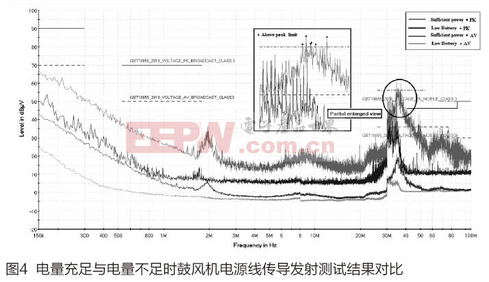 为了验证是否存在鼓风机内部信号发射时间大于驻留时间等因素导致电源线传导噪声峰值测试结果不准确,对电源线传导发射噪声进行重复测试,结果峰值数据居然随测试次数增加逐渐下降。对测试现场进行干扰排查,发现鼓风机风速下降。而鼓风机风速下降是由蓄电池电量降低引起的。