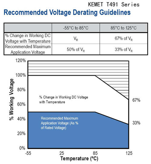 (1) 对于上述介绍的钽二氧化锰电容,进行电压降额,如图1所示,钽二氧化锰电容的工作电压随温度升高而降低,温度高于85℃时推荐使用电压为额定电压的33%,失效风险可大大降低。