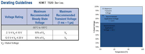 (3) 改用钽聚合物电容:上述介绍的是价格较低的钽二氧化锰电容,它具有较多致命弱点,以致在某些场合被禁用。而钽聚合物电容除了保留钽二氧化锰电容的诸多优点外,其失效风险大大降低。图3示出了钽聚合物电容的推荐使用电压,较钽二氧化锰电容其电压承受能力明显提升。