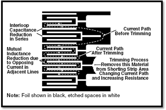 这些功能有助于提高系统稳定性和可靠性,精度、稳定性和速度之间不必相互妥协。为获得精确电阻值,大金属箔晶片电阻可通过有选择地消除内在“短板”进行修整。当需要按已知增量加大电阻时,可以切割标记的区域 (图2),逐步少量提高电阻。