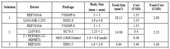 下方的表1显示所需空间的简单计算结果(只考虑器件本体尺寸)。通过从一个封装尺寸为4.64 mm2的集成解决方案中提供双输出,相对于解决方案1和解决方案2,REF2030将占用的总空间分别减少了83%和67%。从成本角度看,REF2030仅为1.4美元,比解决方案1和2分别低52%和30%。