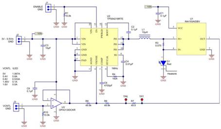 图1显示的是一个通过高侧感测电阻器R3直接驱动LED中电流的降压转换器,TPS54218,同步降压控制器。这个电流感测电压被电流感测监视器,INA193,放大20倍,这样可显著地降低R3中的功率耗散并提升效率。分流监视器的电流反馈信号输出给电阻分压器 (R6/R8),这形成了到VSENSE的完整反馈路径。