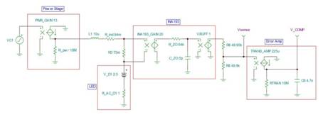 图2是仿真控制回路的图1的简单SPICE模型。VC1是COMP引脚上的电压,直接驱动跨导增益为13的功率级(控制器更多的内部细节请参见TPS54218数据表内的图31)。这个电流通过电感器和感测电阻器来直接驱动LED。需要注意的是,电感值和LED值的变化不会对响应产生影响,这是因为电感器中的电流受到了控制。
