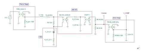 图2是仿真控制回路的图1的简单SPICE模型。VC1是COMP引脚上的电压,直接驱动跨导增益为13的功率级(控制器更多的内部细节请参见TPS54218数据表内的图31)。这个电流通过电感器和感测电阻器来直接驱动LED。需要注意的是,电感值和LED值的变化不会对响应产生影响,这是因为电感器中的电流受到了控制。