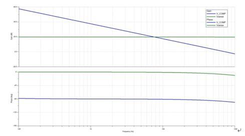 外部补偿组件C6从这个点(V_COMP)上接地。需要注意的是,V_COMP也是我们回路仿真的起始点(VC1)。回路增益是V_COMP引脚上测得的电压除以VC1上的注入扰动。所以,通过将VC1设定为1Vac信号,回路增益最终就是V_COMP上测得的电压。