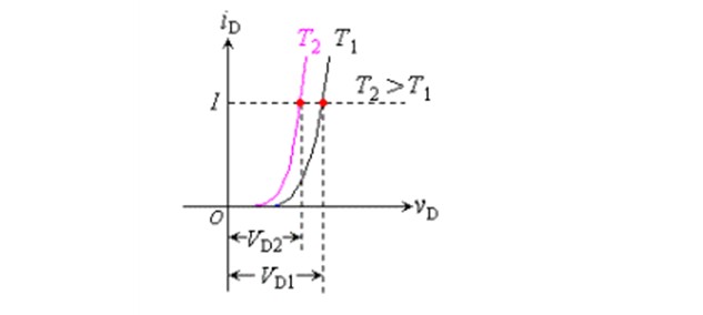 我们知道,二极管的正向电压VF和BJT的VBE都大约是0.6V的样子,而且它们的温度系数约为-2mV/oC,也就是说,在一定温度范围内,温度每升高1oC,它们的正向压降就将减小2mV左右,示意图如下,
