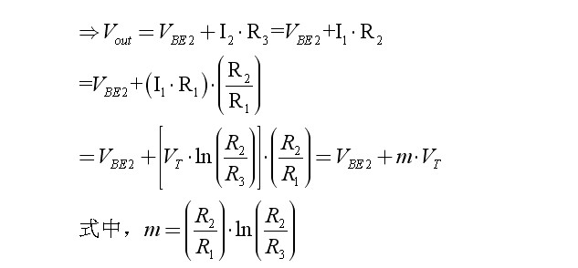 这里m是热电压VT的加权系数。别忘了一个事实:VBE的温度系数约为-2mV/OC0。所以只要适当地设定m的值就可以使得Vout的温度系数在很宽的温度范围内接近于0!这就是带隙型稳压电路的核心思想所在。