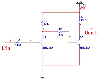 5V信号从Uin输入,当Uin为高电平的时候,Q1导通,此时节电3的电压被拉底,Q2就截止,Uout输出3V,这就是实现了5V输入,3V输出的效果;当Uin为低电平的时候,Q1处于截止状态,节电3的为3V,此时Q2导通,Uout输出低电平。刚好和输入的状态相吻合,但是幅度变为3V。