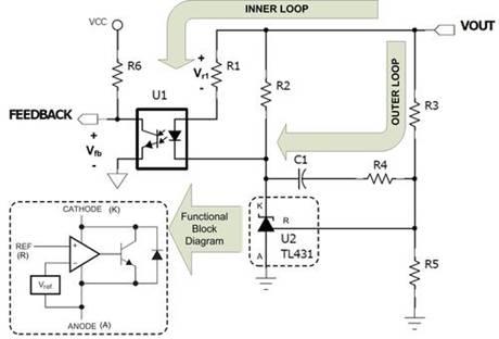 图1展示了反馈系统。内部反馈环路是由上拉电阻器(R1)形成的。该环路通常被称为快速环路,因为输出中的任何微扰均可立即影响该路径中的光耦合器电流。外部环路是通过电阻器分压器和TL431补偿实现的返回路径。这是速度较慢的环路,因为该环路中的补偿组件会影响输出电压的响应。