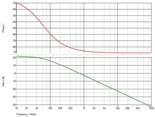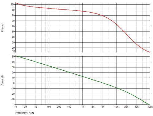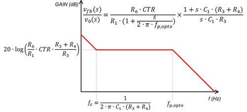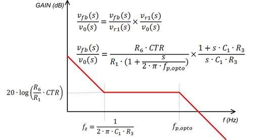 首先,让我们考虑一下简单的积分电路是什么样子。要实现这一点,我们只需在自己的电路中将R4设置成零欧姆。所得的传递函数和增益坐标图(从“输出电压”到“反馈”)如图2所示。有趣的是,我们有一个DC极点和一个由R3和C1形成的零点。由于内部环路的存在,零点有些反直观。频率高于这个零点时,增益只等于两个电阻器(R6和R1)的比乘以光电耦合器的电流传输比(CTR)。频率在10kHz以上时,光电耦合器带宽会产生了一个可限制增益的极点。