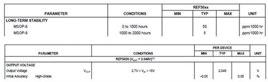 为了说明实际 IC 的生命周期偏移,让我们考虑一下低噪声、低漂移 REF5025 高精度电压参考及其输出初始精度规范的长期稳定性。