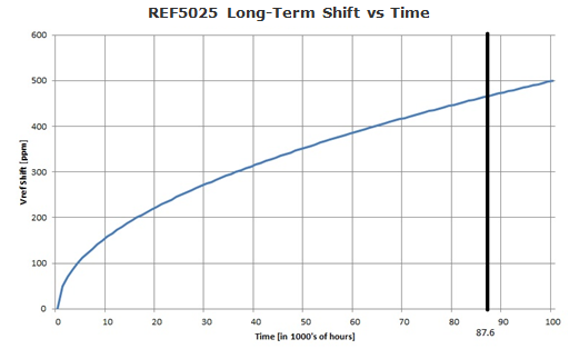 例如,在经过 25,000 小时不间断现场工作后,REF5025 的典型输出电压偏移可用以上公式计算,50ppm*√25=250ppm,而 10 年(87,600 小时)后,偏移值则将为 50ppm*√87.6=468pp。因此在使用寿命末期,REF5025 输出电压偏移正如预计的那样,在 500ppm 允许偏移范围内,等于产品说明书最大初始精度规范的 0.05%。
