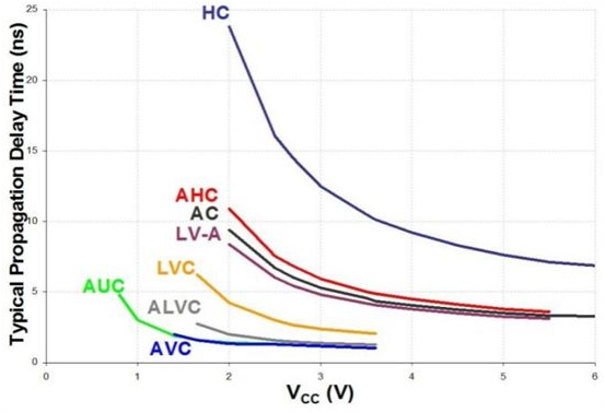 图1:八大逻辑系列的典型传播延迟和电源电压