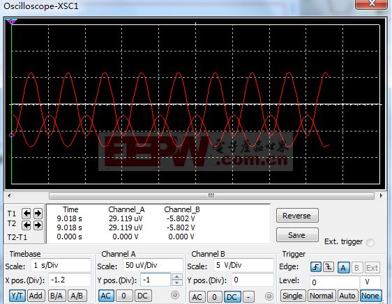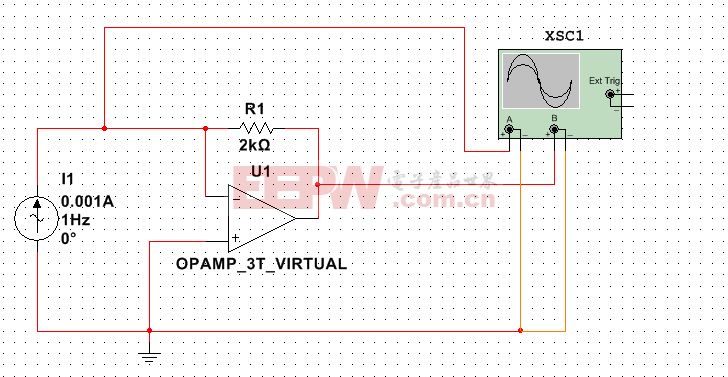 当设置输入电流源为1Hz电流强度为1mA时,在multisim上仿真结果如下: