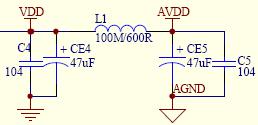 图一是一个mp3中的vcc和avcc电源滤波电路, vcc和avcc的电压都是3v,vcc是给主控供电的,要求电压稳定并且是纯净的直流电成分,不允许有交流电成分!avcc是给音频放大电路提供能源的,要求有足够的直流电能量提供!可能要问,两个电压即使都是3v为什么还要接上一个电感L1呢?音频放大电路在放大声音的时候,随着高音低音,音大音小的变化,所需要的电流也会大小变化剧烈,电感电容虽说脾气相反但有一个共同的地方就是电感和电容两端的电压不能突变,所以电感L1和两边的电容有一个稳定vcc和avcc电压的作用,也就是声音放大造成电压波动不至于影响供给主控工作的vcc电压的波动;除了这个作用,由L1和两边的电容还有第二个作用,那就是滤波作用,由于声音放大电路里很容易参杂进去交流成分,这个交流成分是决不能进入到vcc电压进入主控的,L1就是为了阻止交流成分进入的主要元件,受到阻挡的交流电成分不能通过L1,就只好乖乖的通过C5和 CE5进入地而消失了!C5和 CE5+L1+C4和 CE4组成的电路又叫“π型”滤波器!