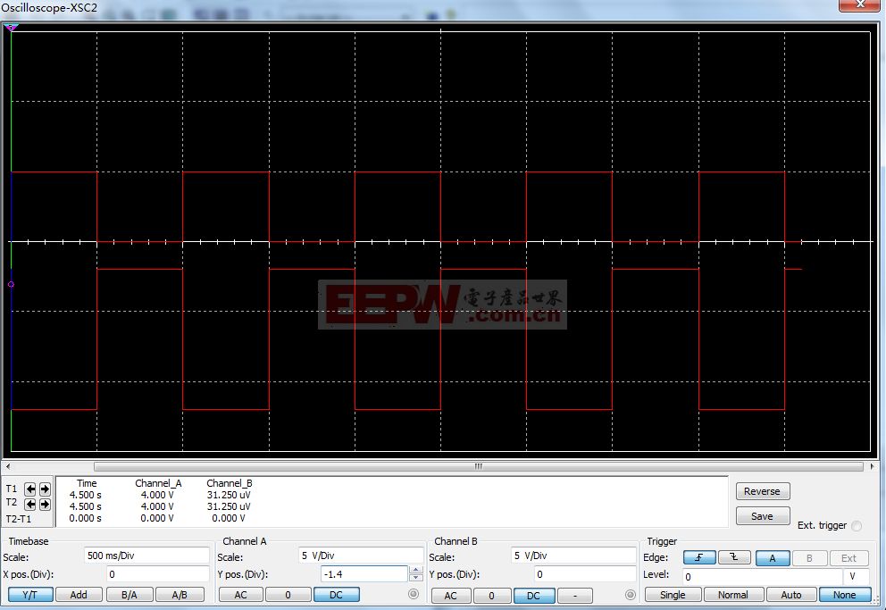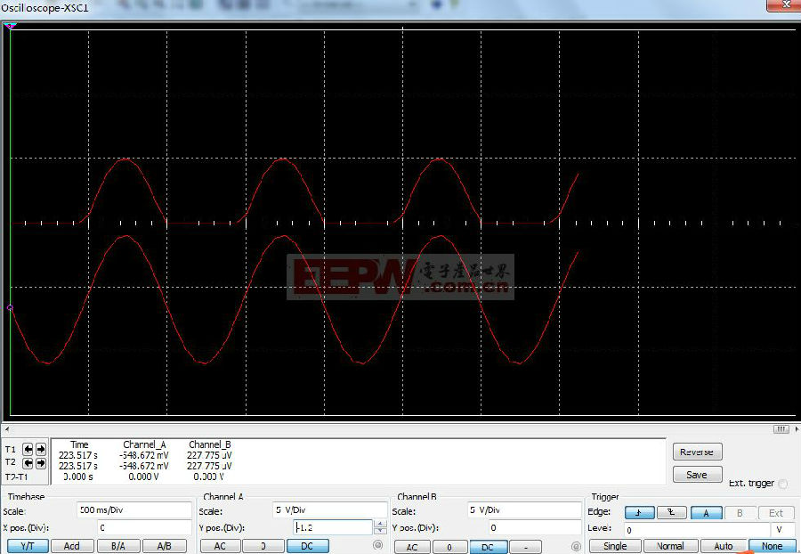 在信号源XFG1中采用1Hz的5Vpp的正弦波来驱动Pmos场效应管,而场效应管的vcc也采用5v直流电压,示波器XSC1中A通道显示驱动电压的波形,B通道显示源级的电压,仿真结果如下: