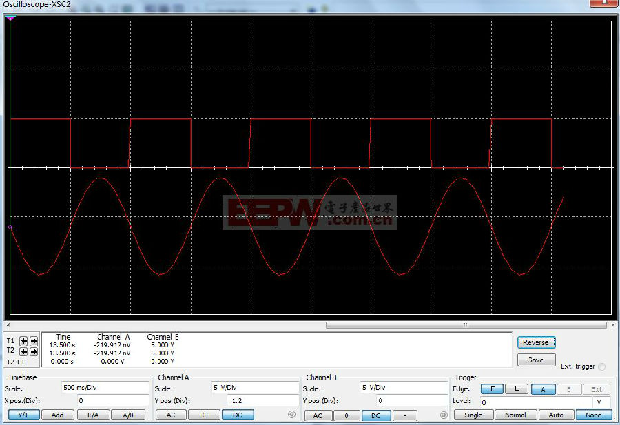 在信号源XFG2中采用1Hz的5Vpp的正弦波来驱动Nmos场效应管,而场效应管的vcc也采用5v直流电压,示波器XSC2中A通道显示驱动电压的波形,B通道显示源级的电压,仿真结果如下: