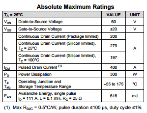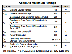 下面的图表1a和1b分别给出了CSD18536KCS和CSD18535KCS60V TO-220 MOSFET数据表首页上出现的绝对最大额定值表。这两个器件的封装额定值均为200A,不过,由于CSD18536KCS具有更低的RDS(ON)和热阻抗,它具有349A的更高芯片限值,这表明,在处理同样数量的连续电流时,它的运行温度应该比CSD18535KCS的工作温度低。不过,我们还是不建议将这两款器件长时间运行在电流超过200A的条件下。从FET的角度说,这就意味着任一超过100ms的电流脉冲;超过这个值的电流脉冲基本上就可以被视为DC脉冲。