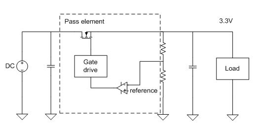 图1. 线性稳压器框图。注意,旁路元件将在其自身和负荷之间形成一个分压器,起到耗散功率的作用。