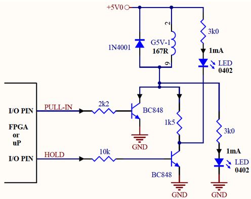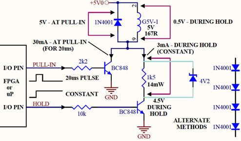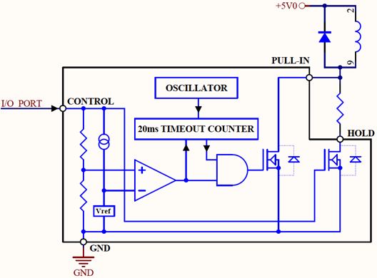 如果可以的话,用两个输出来控制一个继电器将会是最合理的方法:用其中一个I/O端口使继电器吸合,用另一个I/O端口使继电器保持吸合。首先将两个端口都置为高电平,但在约20ms后,将吸合(PULL-IN)信号返回低电平,而将保持(HOLD)信号处于高电平,直到需要释放继电器时为止。