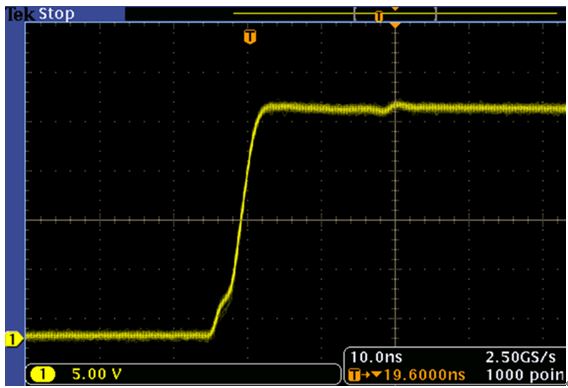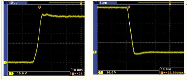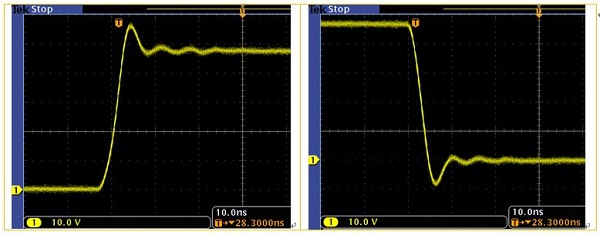 为了降低示波器探头对测量结果的影响,我们在电路板上焊接测量接地探针,并去除示波器探头上的地线,如图7所示。通过这种方法,我们可以大大降低示波器探头地线对测量引入的振铃。图8是使用这种方法捕获到的PWM开关信号的前后沿波形。