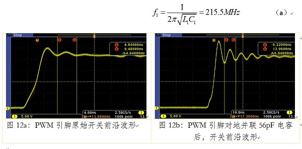 下面以一个实例介绍snubber电路元件值的选取。图12a是一款降压DC-DC在PWM开关引脚处测到的波形。在PWM信号开关时,伴随着振铃现象。通过示波器测量到的振铃频率为215.5MHz。我们可以构建第一个方程: