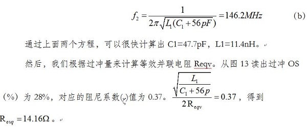 为了得到L1和C1的值,我们需要构建另外一个方程。我们给电容C1并联一个小电容:在PWM引脚临时对地焊接一个56pF的电容。这时,振铃频率变为146.2MHz,如图十二b。据此,我们构建另一个方程: