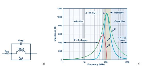 铁氧体磁珠可依据三个响应区域分类:感性、阻性和容性。查 看ZRX 曲线便可确定这些区域(如图1b 所示),其中Z 表示 阻抗、R 表示电阻、X 表示磁珠的电抗。为了降低高频噪声,磁 珠必须处于阻性区域内;电磁干扰 (EMI) 滤波应用尤其需注意 这一点。该元件用作电阻,可阻止高频噪声并以热量的形式耗 散。阻性区域出现在磁珠交越频率 (X = R) 之后,直至磁珠变为 容性的那一点为止。此容性点位置为容性电抗 (–X) 绝对值等于 R 的频率处。