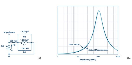图1. (a) 简化电路模型 (b) 采用Tyco Electronics BMB2A1000LN2 测量的ZRX曲线。