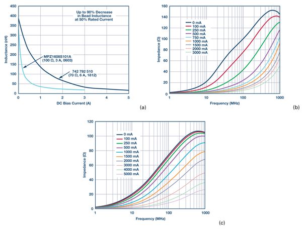 图3. (a) 直流偏置对磁珠电感的影响以及相对于直流偏置电流 的曲线 (b) 采用TDK MPZ1608S101A 磁珠 (c) 采用Würth Elektronik 742 792 510 磁珠。