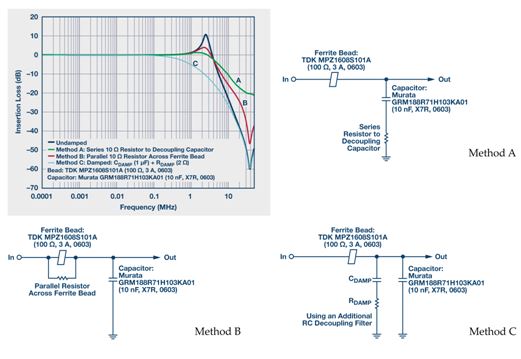 方法C 是添加大电容 (CDAMP) 与串联阻尼电阻 (RDAMP) 的组合,通常这种方法最佳。